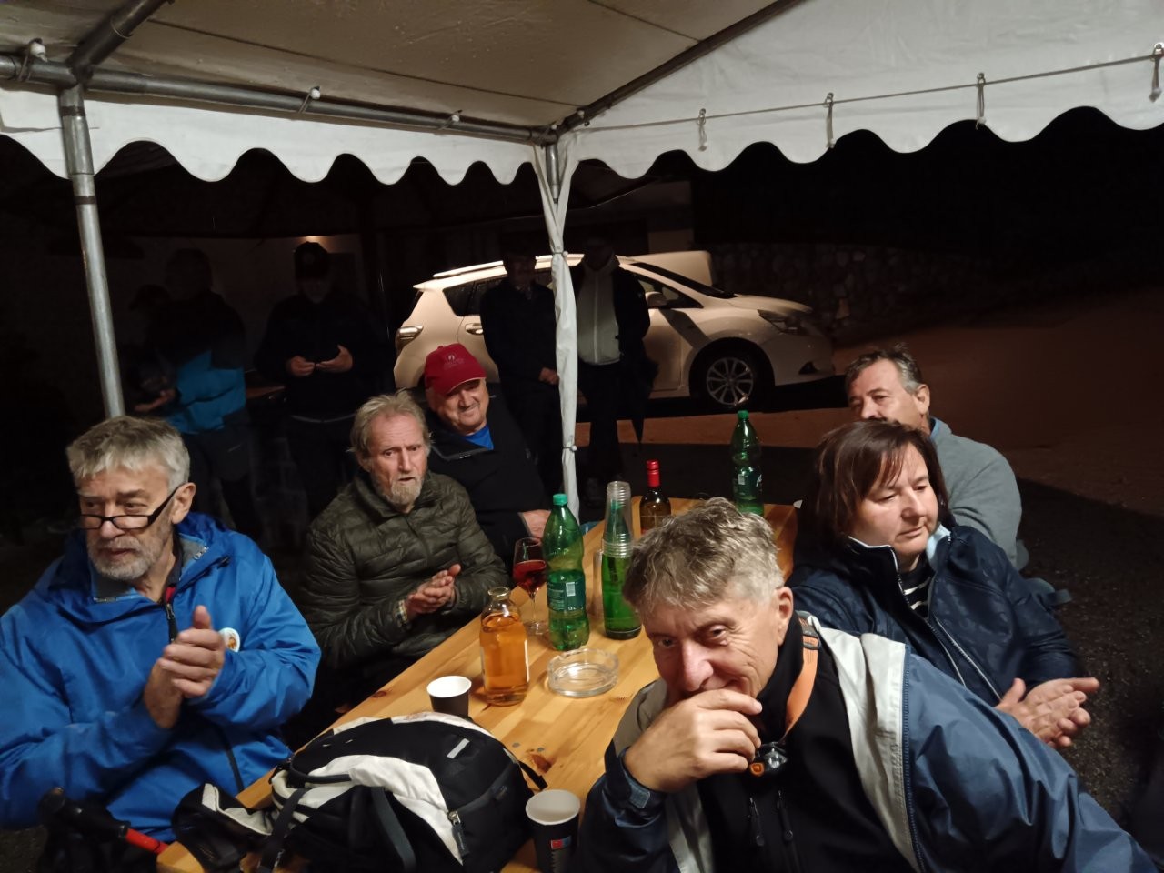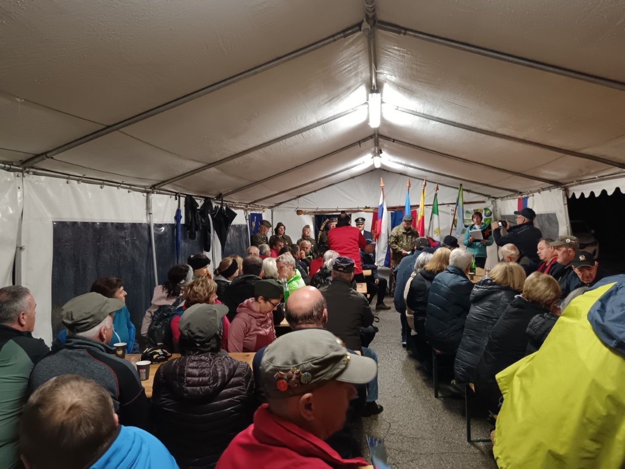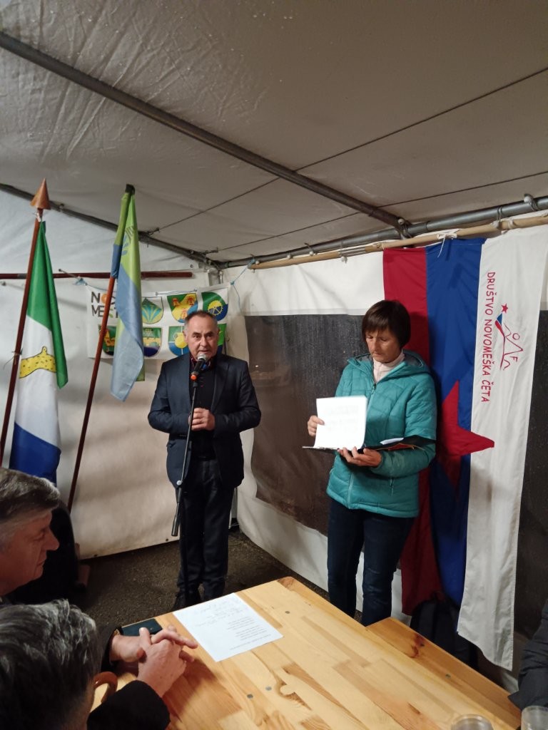 Slabo vreme je odvrnilo številne pohodnike. Bilo nas je le za poln šotor. Tu se je prejšna leta dogajal velik boj za prostor, kjer bi mogli v miru pojesti klobaso in spiti pijačo. Letos je bilo prostora dovolj. Tudi proslava je potekala v tem šotoru, vodila pa jo je Terezija Potočar, ki nam je povedala tudi nekaj zgodovine o Novomeški četi. Uvodni govor je imel Jože Papež, župan domače občine, slavnostni govornik je bil letos Marjan Križman, predsednik zveze združenja borcev za vrednote NOB. Sledile so recitacije partizanskih pesmi, na harmoniko pa je zaigral Mitja Bukovec. Še bi ostali, a bilo je mrzlo, mokro in pozno. Morali smo si priboriti še prevoz do doma, saj za pohod, blizu štirinajst kilometrov poti nazaj, ni bilo računati. Vse se je dobro končalo. Ni nam bilo žal prezeblih prstov na rokah, mokrih oblačil, strašnih nočnih pošasti med potjo, niti blata na poti.