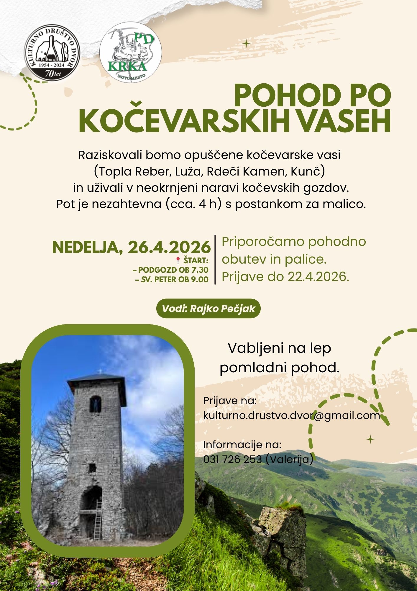 Kulturno društvo Dvor in Planinsko društvo Krka, Planinska sekcija Dvor, vabita na zanimiv in doživljajsko bogat pohod po sledeh nekdanjih kočevarskih vasi, ki bo potekal v nedeljo, 26. aprila 2026. Pohod bo vodil Rajko Pečjak.